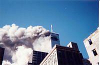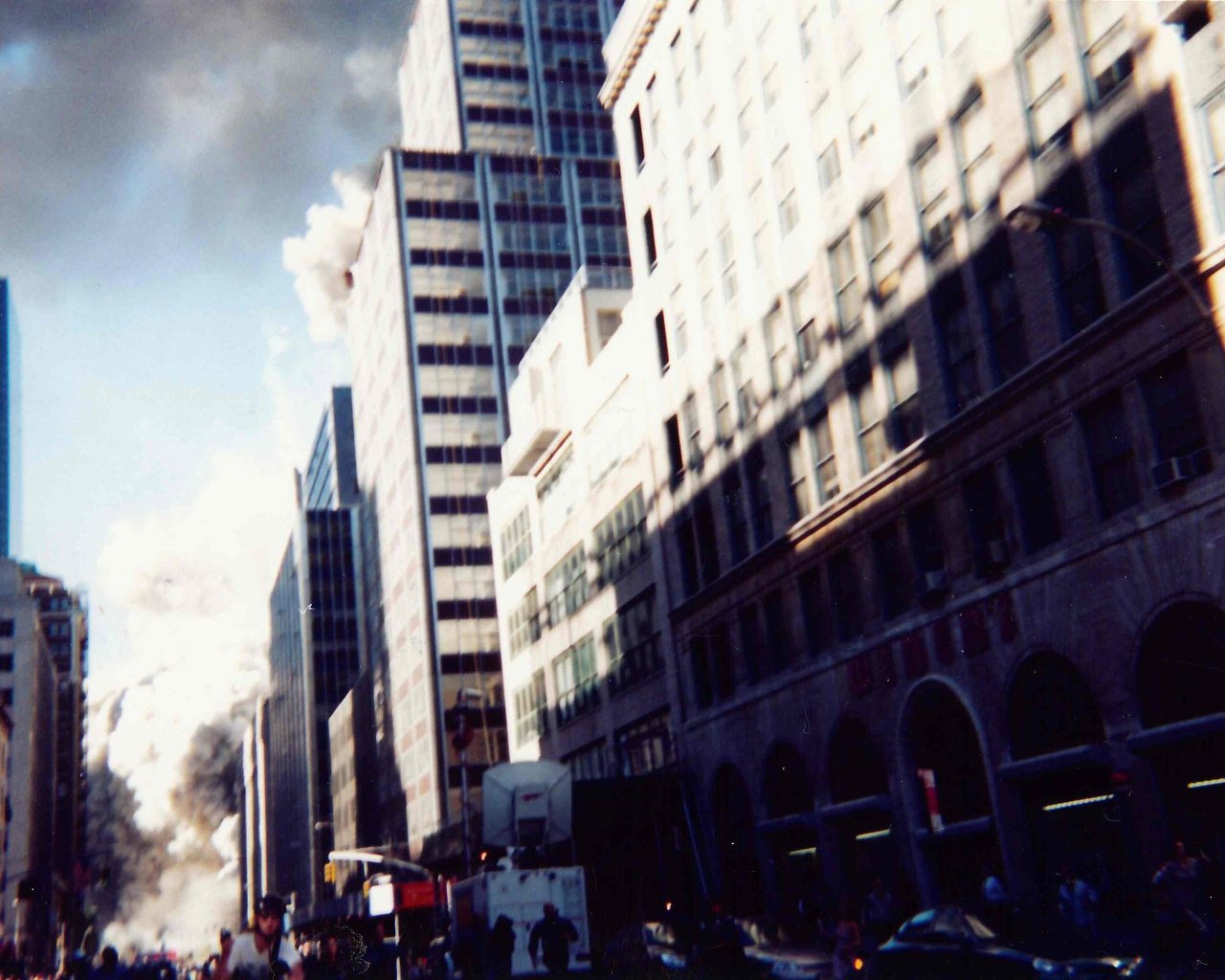 This photo is blurry, perhaps because what it catches is so unbelievable. The south tower is falling, the pops and